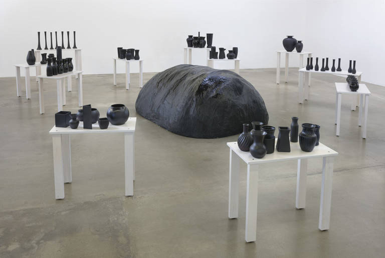 IMAGE: Rodney McMillian, pod: frequencies to a manifestationing (detail), 2016. Vases, wood shelves, spray paint, fabric, chicken wire, PA system, and sound installation. Dimensions variable. Artwork © Rodney McMillian. Image courtesy the artist and Susanne Vielmetter Los Angeles Projects. Photograph by Robert Wedemeyer.