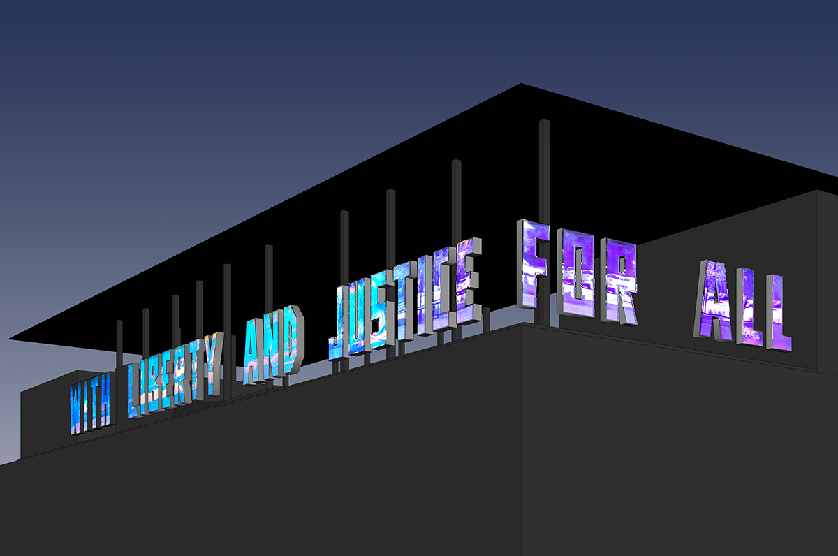 IMAGE: Jim Hodges, With Liberty and Justice for All (A Work in Progress), 2014–2016. Stainless steel, Dichrolam, acrylic, enamel paint, and LED lights. Installed, 84 x 1,737 x 10 inches. Installation view, The Contemporary Austin – The Moody Rooftop at the Jones Center, Austin, Texas, 2017. Artwork © Jim Hodges. Courtesy the artist and Gladstone Gallery, New York and Brussels. Image © The Contemporary Austin. Photograph by Brian Fitzsimmons.